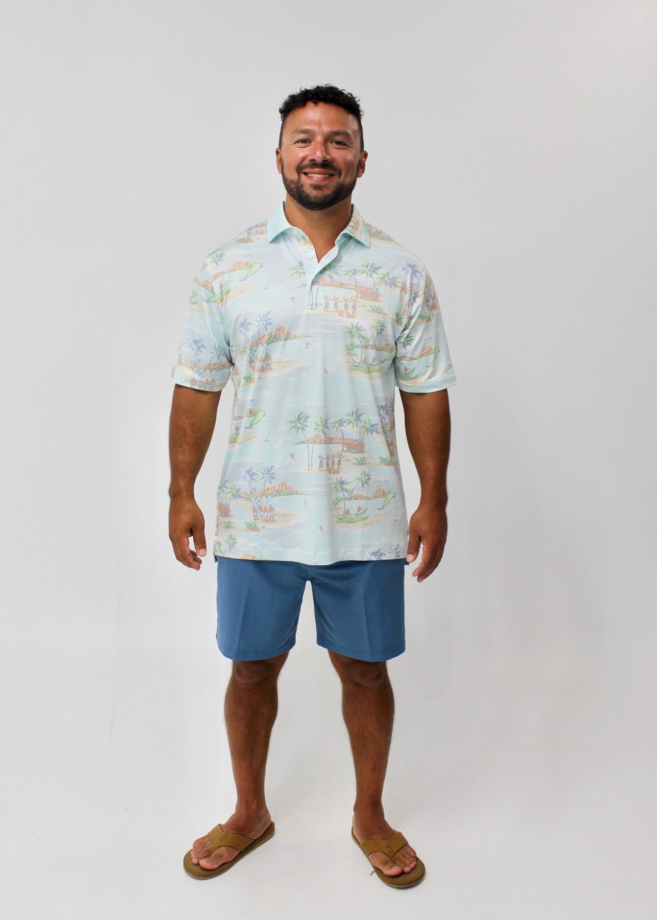 New from Anchor Boys! Check out this lightweight tech polo with Hawaiian Scene print.
