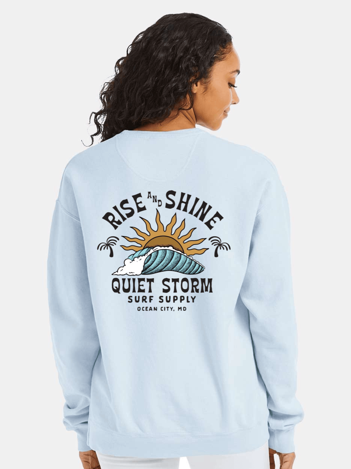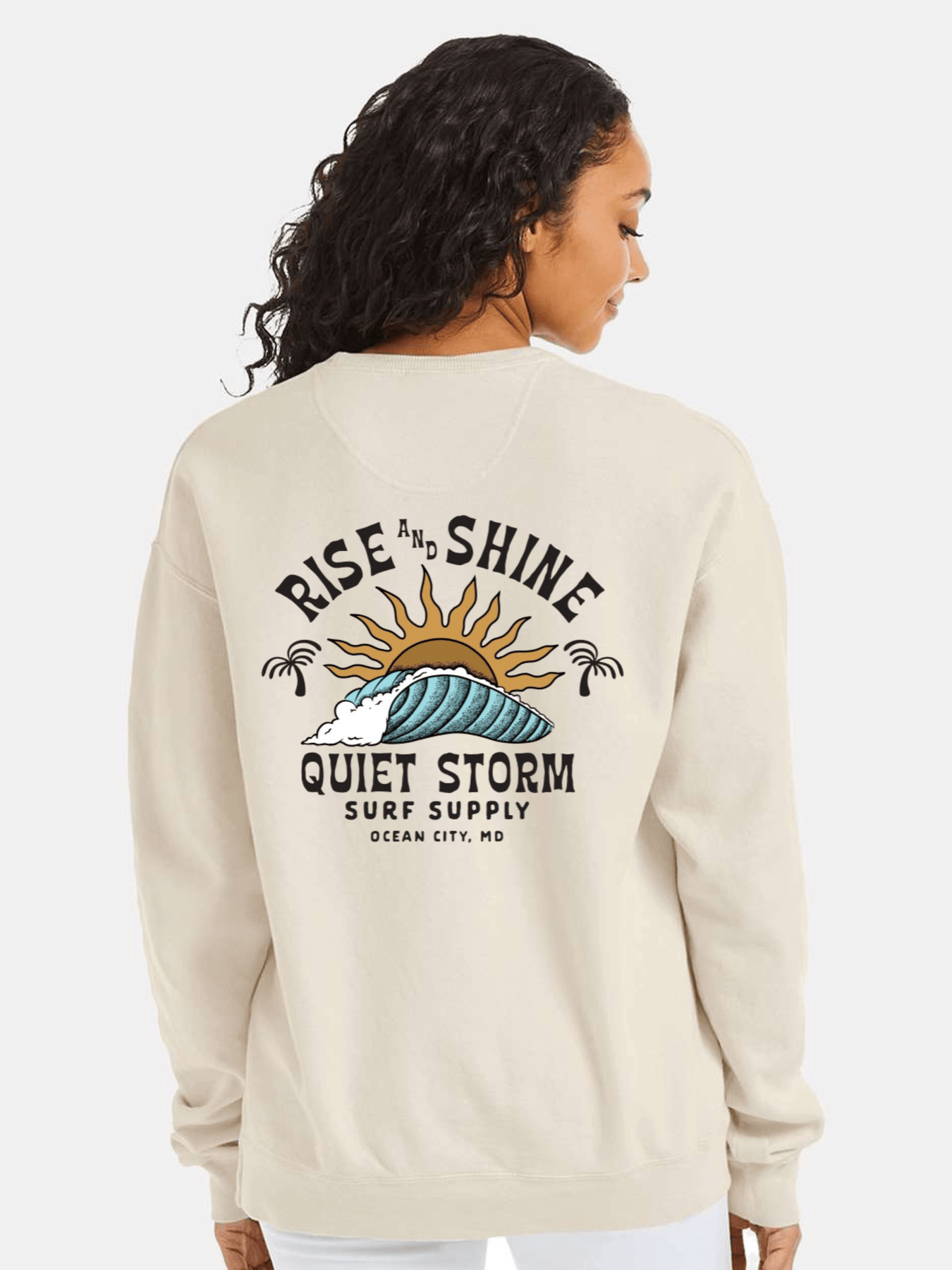 Our classic crew neck fleece featuring our new Rise N Shine design with a logo graphic on the left chest and center back.
