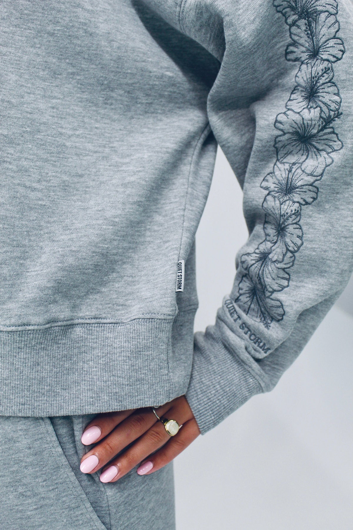 Elevate your Sunday style with this essential hoodie. It's our new favorite! Featuring hibiscus embroidery on both sleeves. Matching sweatpants sold separately.